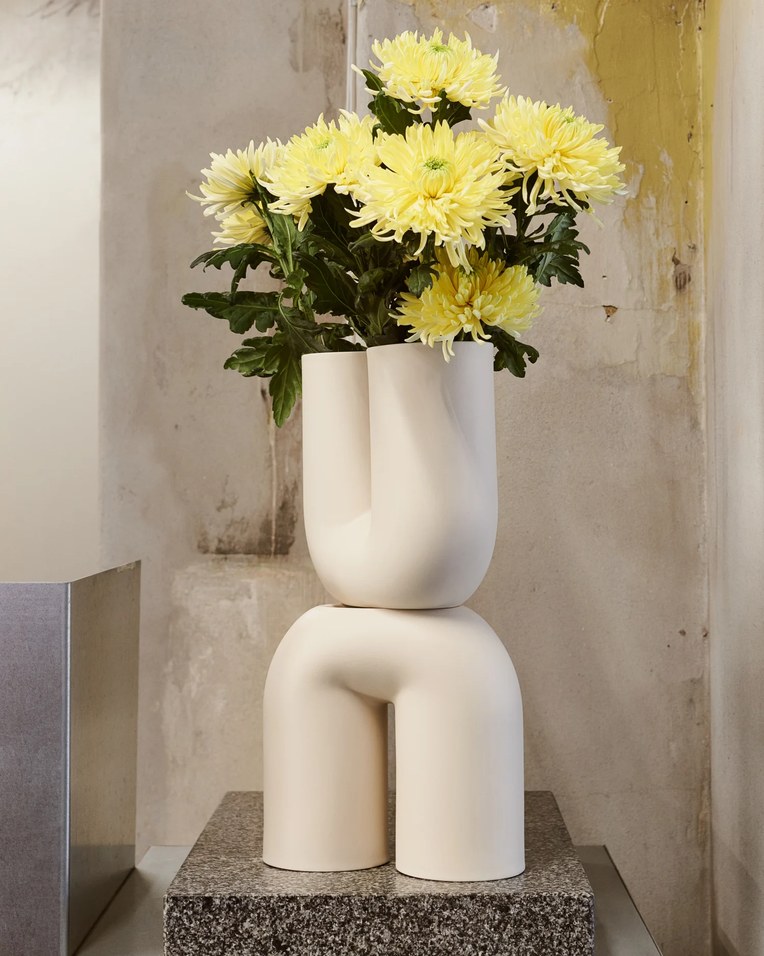The Kink Vase brings a contemporary form to the archetypal flower vase. With its double opening, the vase adds a sculptural sentiment to the room, even when not in use. The design is made in porcelain that has been glazed on the inside for a refined touch