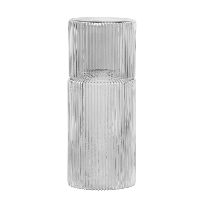 This beautiful decanter set Smoked from the Ripple collection by Ferm Living has a stylish design. The set is perfect for filling spirits or for use as an accessory. The set consists of a carafe and a glass